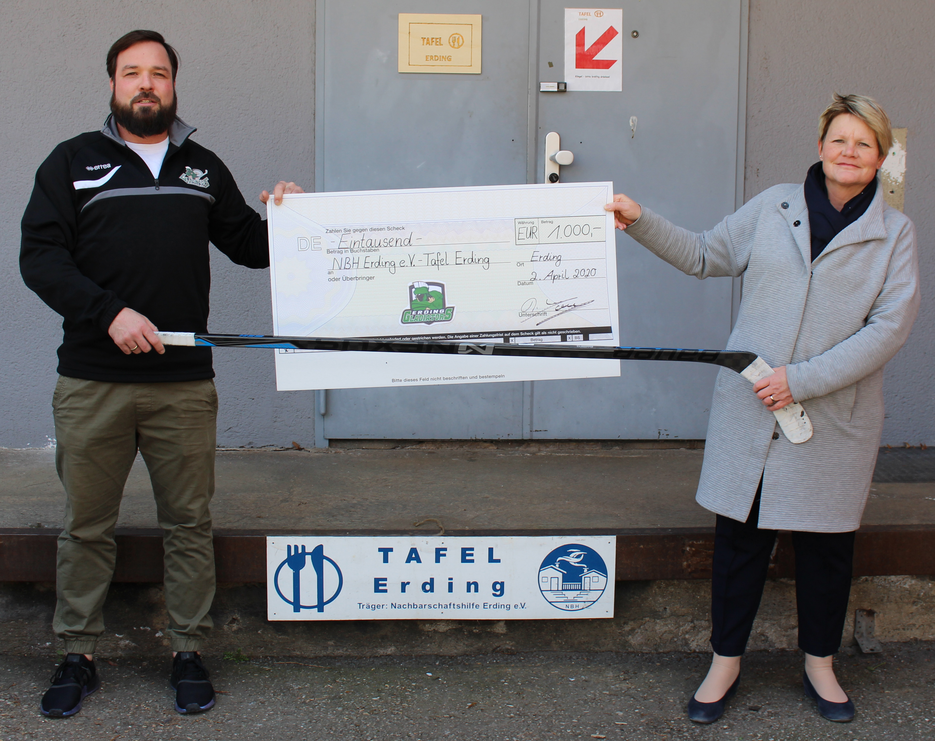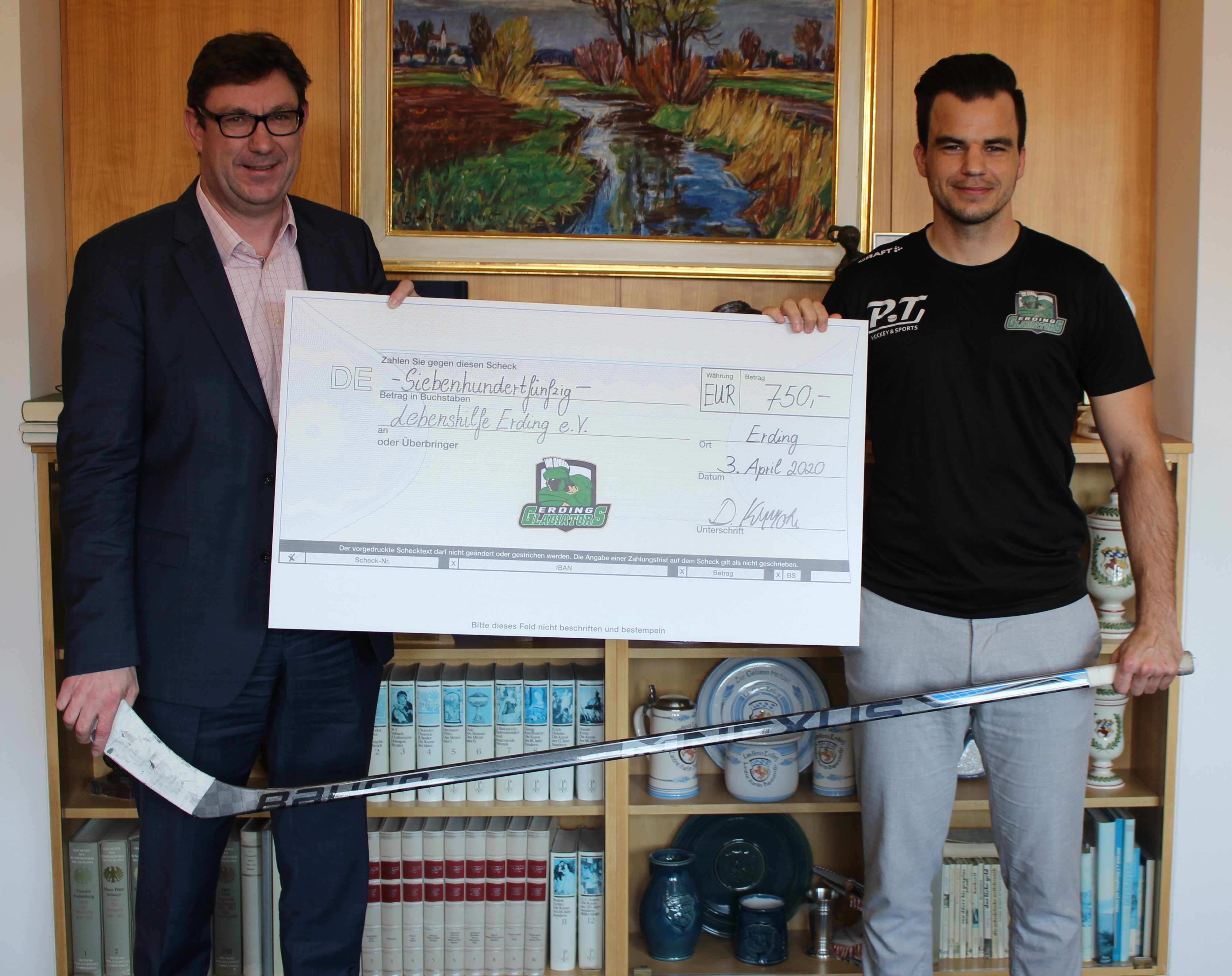 Einen Scheck über 750 Euro für die Lebenshilfe hatte schließlich Daniel Krzizok dabei, als er bei Landrat Martin Bayerstorfer vorbeischaute, der das Geld in seiner Eigenschaft als Vorsitzender der Lebenshilfe Erding entgegennahm. „Das können wir ganz gut brauchen für unseren Neubau mit 90 Zimmern“, sagte Bayerstorfer. „Dort werden viele unterschiedliche Wohnformen entstehen, auch für Paare.“ er. Ziel sei es, Menschen mit Behinderung so viel Selbstständigkeit zu ermöglichen, wie es nur gehe. Angedacht sei darüber hinaus, auch an Nicht-Behinderte zu vermieten. Auch Bayerstorfer fand die Aktion der Gladiators „großartig“. Für den richtigen „Corona-Abstand“ bei den Scheck-Übergaben sorgte – wie sollte es anders sein – ein Eishockeyschläger.